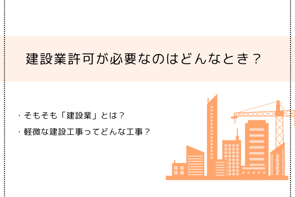 建設業を営む際に必要になる許認可が建設業許可です。 といっても、具体的にどの範囲の工事業が許可が必要となる「建設業」に該当するのかわからないという方もいるのではないでしょうか。 また、建設業法では「軽微な建設工事のみを請け負う」場合には建...