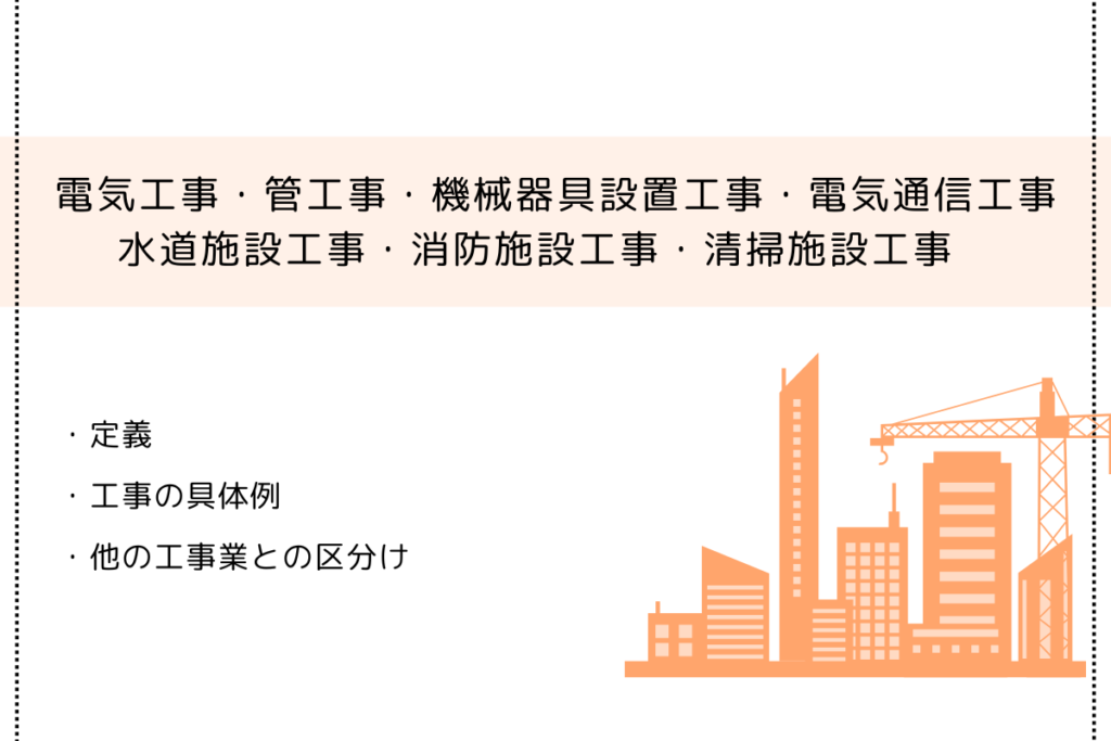 電気工事・管工事・機械器具設置工事・電気通信工事・水道施設工事・消防施設工事・清掃施設工事の定義と具体例まとめ