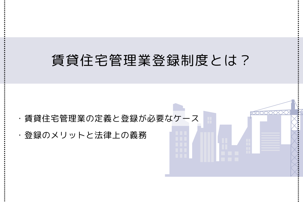 このような背景から、賃貸住宅管理業務の適正な運営を確保し、オーナーや入居者の利益を保護すること、そして賃貸住宅管理業の健全な発展を図ることを目的として、「賃貸住宅の管理業務等の適正化に関する法律」(以下、「賃貸住宅管理業法」)が制定され、一定規模以上の賃貸住宅管理業を営む場合は登録が義務付けられました。