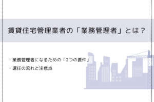 | 業務管理者の配置 | 営業所または事務所ごとに、管理業務に関する知識・経験を有する業務管理者を1名以上配置する。(業務管理者は、賃貸不動産経営管理士または宅地建物取引士であり、かつ一定の講習を修了した者など、要件を満たす必要があります。) |